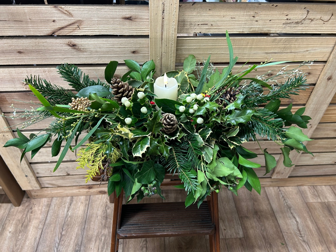 Filled with festive foliage and sprinkled with a snowy dusting. Suppled with an artifical, real wax feel candle to finish off this foliage filled table decoration